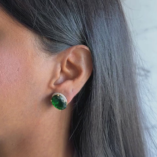 These stunning earrings feature a beautifully cut green gemstone at the center, surrounded by delicate baguette settings that frame the stone perfectly. A timeless piece that adds a touch of refined glamour to any look.