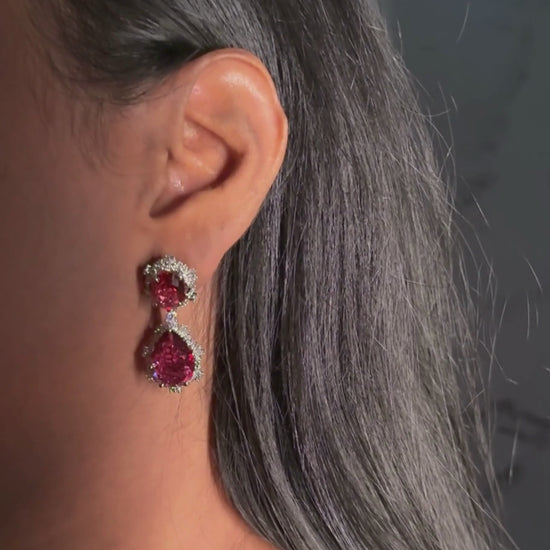 The Blush Belle Earrings in red feature exquisite drop stones with delicate side carvings, offering beauty from every angle. Their gleaming finish and elegant design make them a stunning, eye-catching accessory perfect for adding a sophisticated touch to any ensemble.