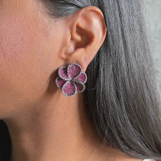 Elevate your collection with these sophisticated Crystal Buds Earrings in pink. Featuring a delicate floral design adorned with vibrant pink gemstones, each earring showcases an invisible diamond setting that adds subtle brilliance without distraction.