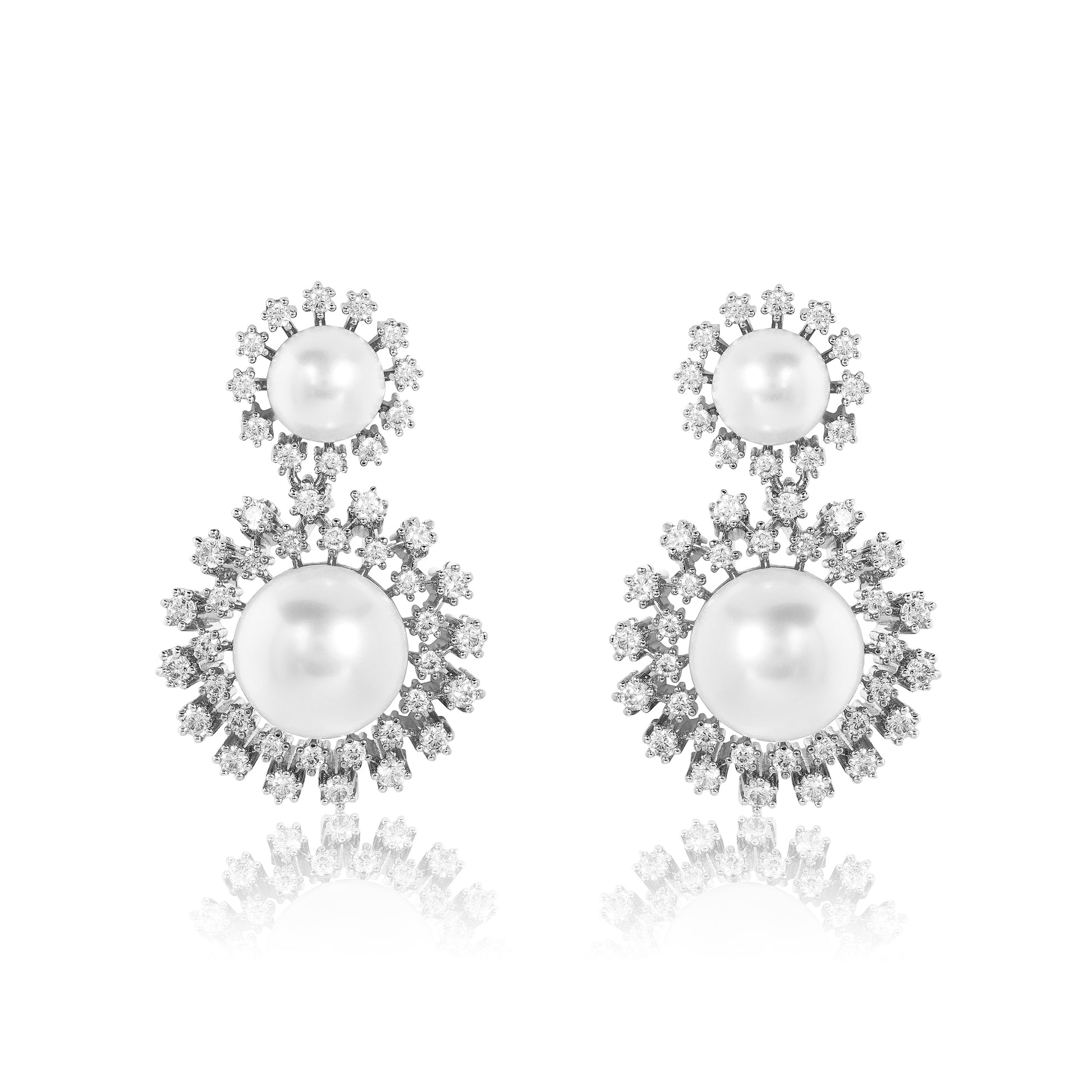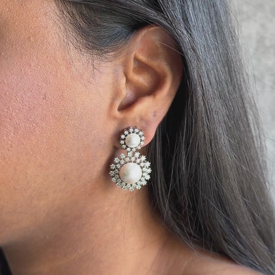 The Galaxy Dust Earrings in white feature a stunning arrangement of pearls and diamonds that evoke the beauty of a starry galaxy. Their classic design offers a sophisticated elegance, making them a versatile accessory that enhances any outfit with subtle luxury. Ideal for both everyday wear and special occasions.