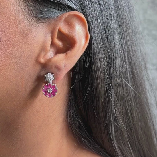 Delicately crafted, the Ira Earrings in pink feature charming floral adorned with sparkling pink gemstones and diamonds. The subtle elegance, makes it perfect for both office wear and an evening dinner.