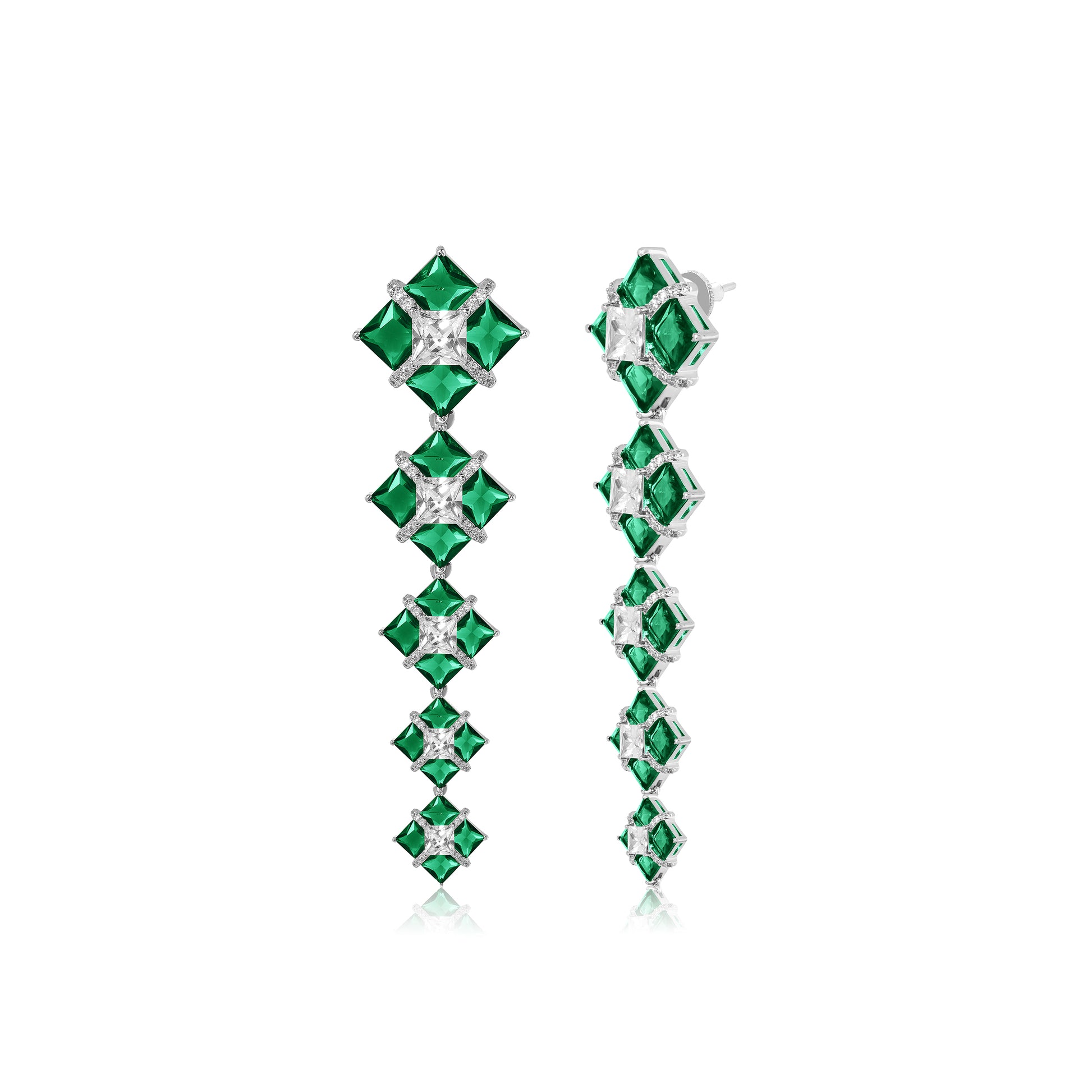 Elevate your evening ensemble with the Lumi Earrings in green. Featuring striking green crystals paired seamlessly with sparkling diamonds, these long earrings make a bold yet refined statement.