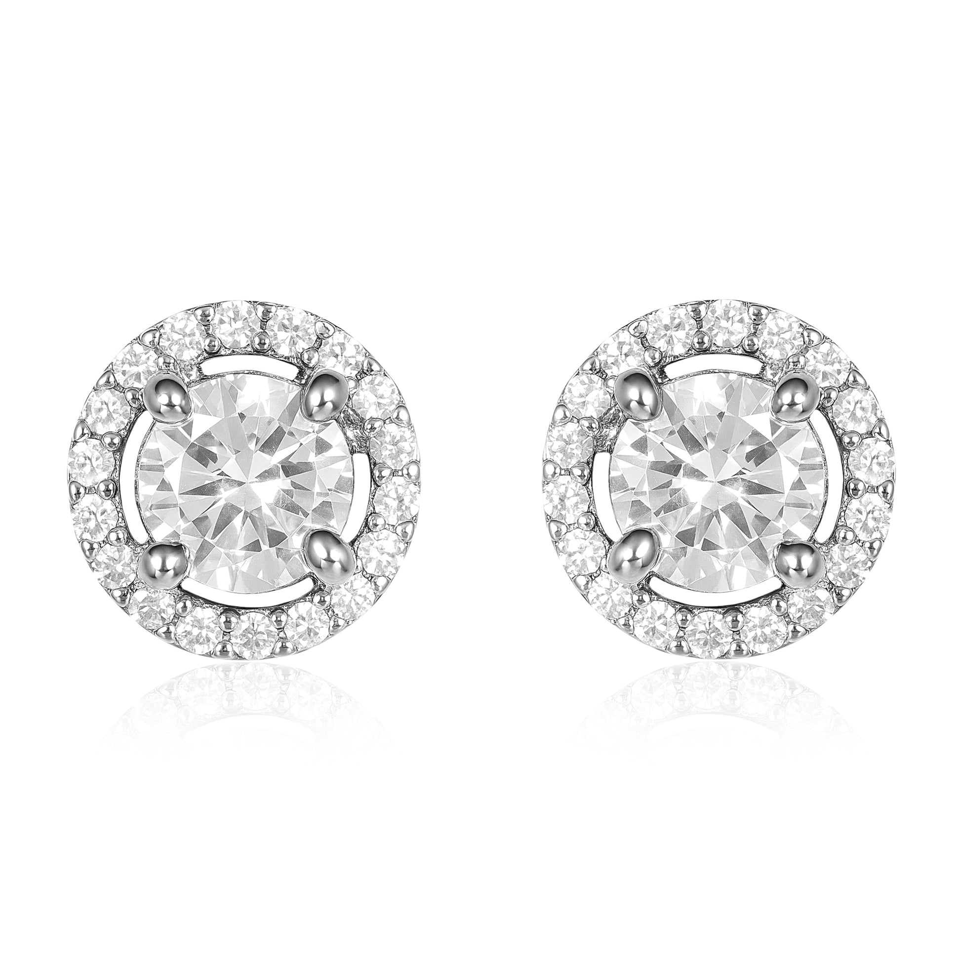 Elegant classic everyday round shaped diamond studs with small diamonds around it in rhodium polish