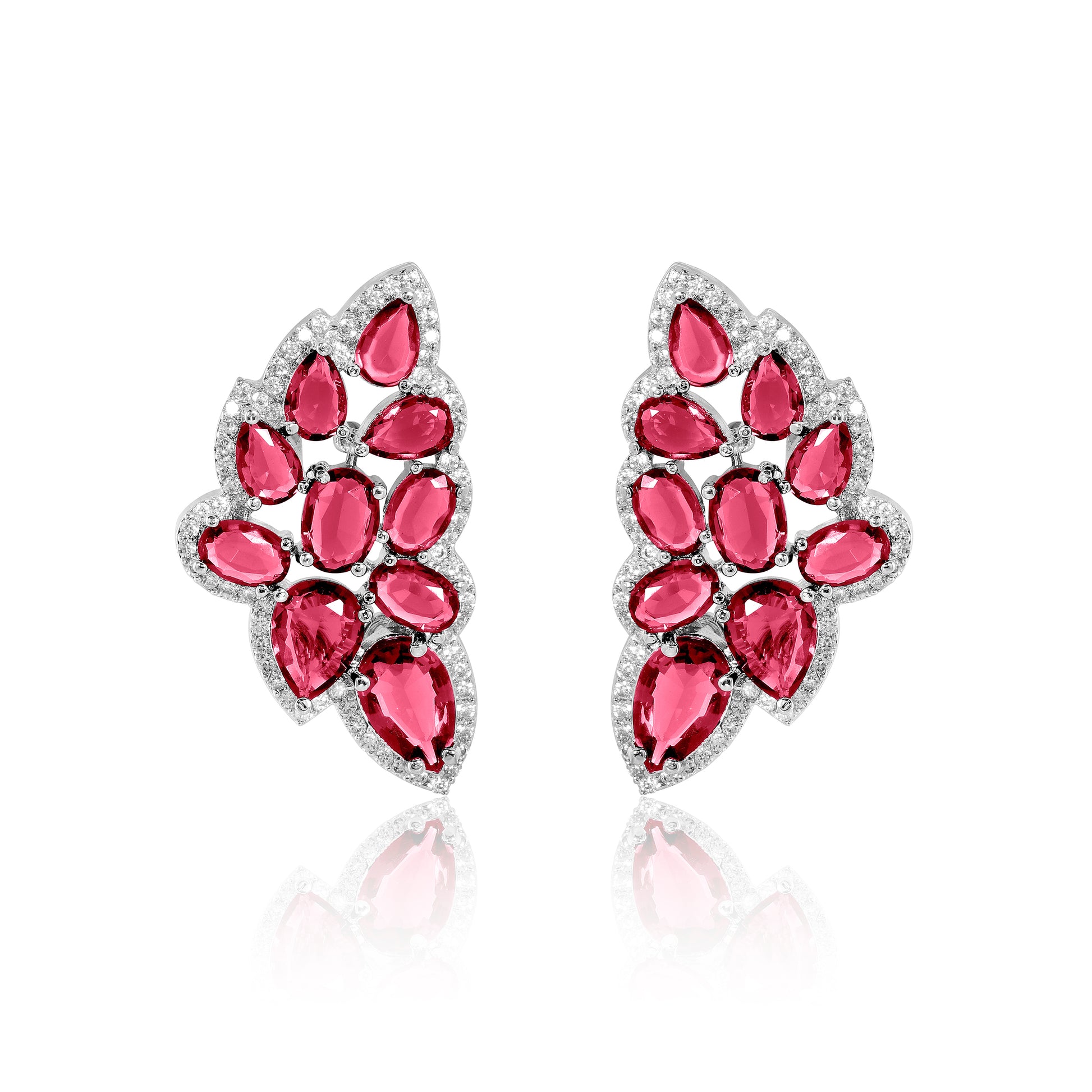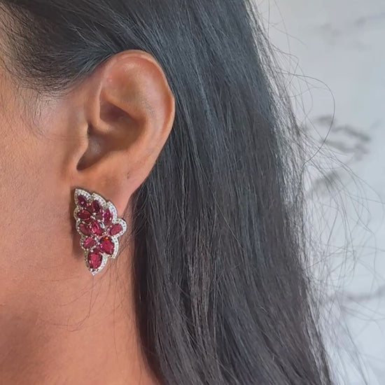 Ruby red gemstones take center stage to form a leaf-shaped striking earrings, beautifully framed by sparkling diamonds.